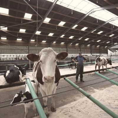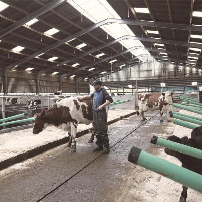 Our farm team built a new dairy shed about ten years ago, and although we weren't cow with calf farming at that time, we knew even back then that we would try this approach, so it was built with the calves in mind. We visited lots of other farms to help us design the dairy shed, and the cubicles are based on a Dutch idea. They are basically just plastic sticks which guide the cows but they’re not rigid so there are much fewer injuries than in our previous, and more typical, steel cubicles. The bedding system is based on a mattress that equates in comfort to field conditions and allows cows to spread out on their sides, as they would on pasture. It requires a lot more space per cow but is clearly liked by the cows.