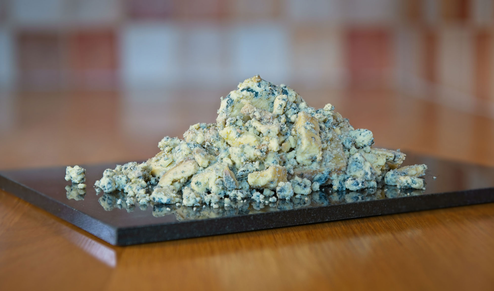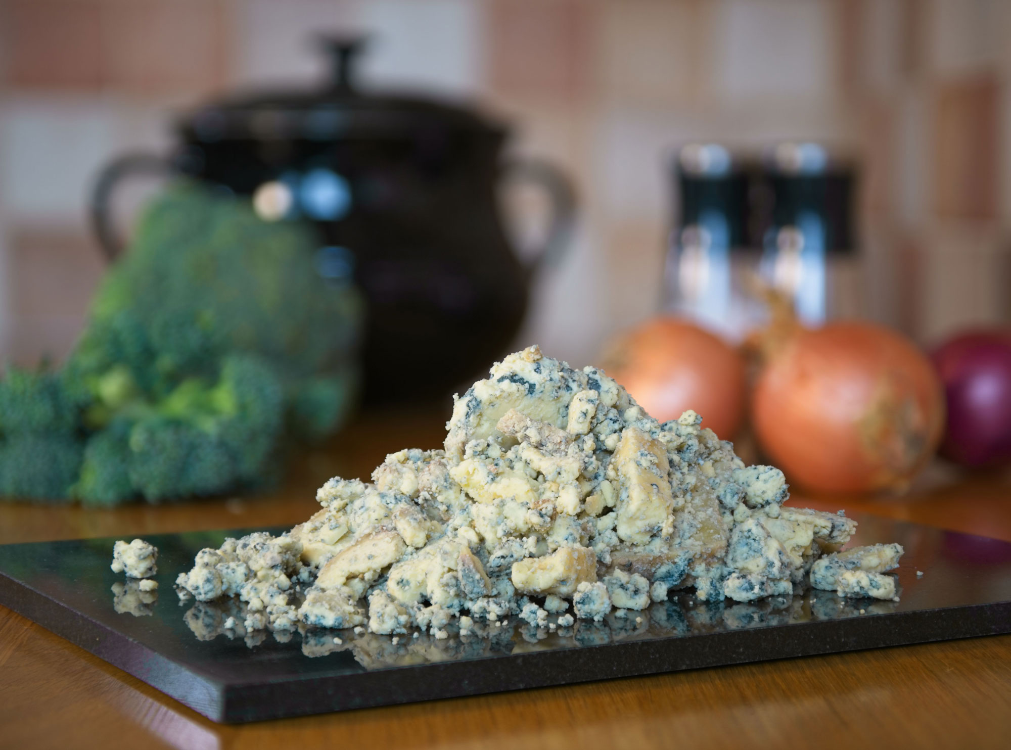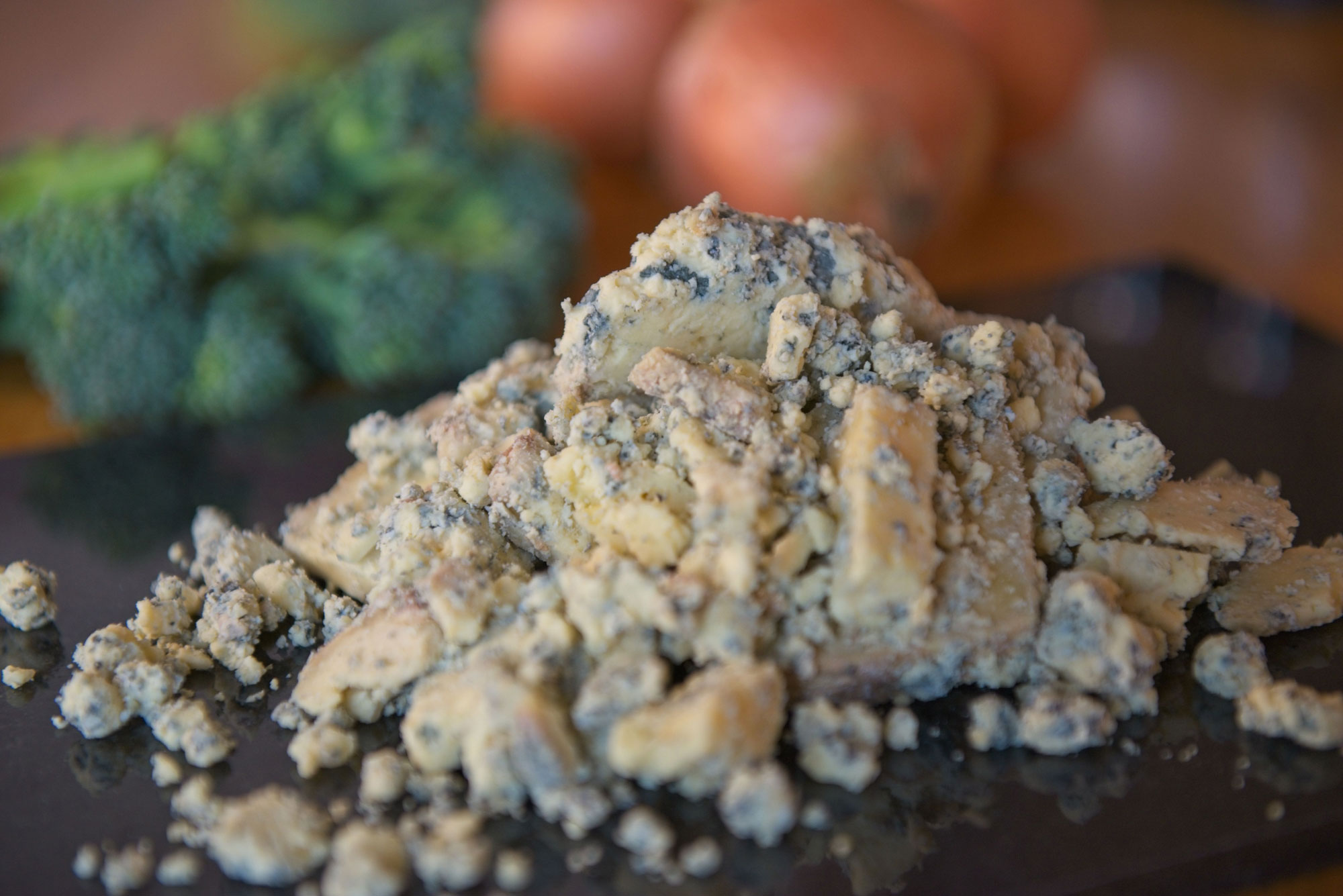 Our Fleet Valley Blue cheese is an unpressed blue, which means that when it’s cut it can be a wee bit crumbly. Each week, alongside neat stacks of blue cheese wedges, we usually find ourselves with quite a lot of blue cheese crumbs.